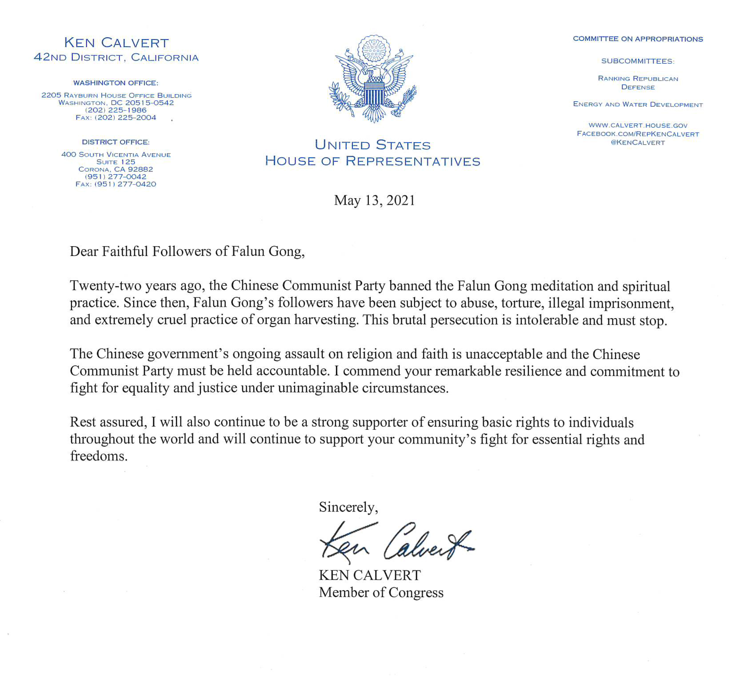 加州第42区国会议员肯·卡瓦特(Ken Calvert)在贺信中赞扬法轮功学员在不可想像的艰难环境中坚韧不屈争取平等与公正的非凡精神。他说,“法轮功学员遭到中共的虐待、酷刑、非法监禁、被残忍地活摘器官,这种残酷的迫害是不能被容忍的,必须立刻停止。”“中共政府对信仰的持续侵害是不能被接受的。中共必须被追责。请相信,我将继续支持你们争取基本人权自由的抗争。”