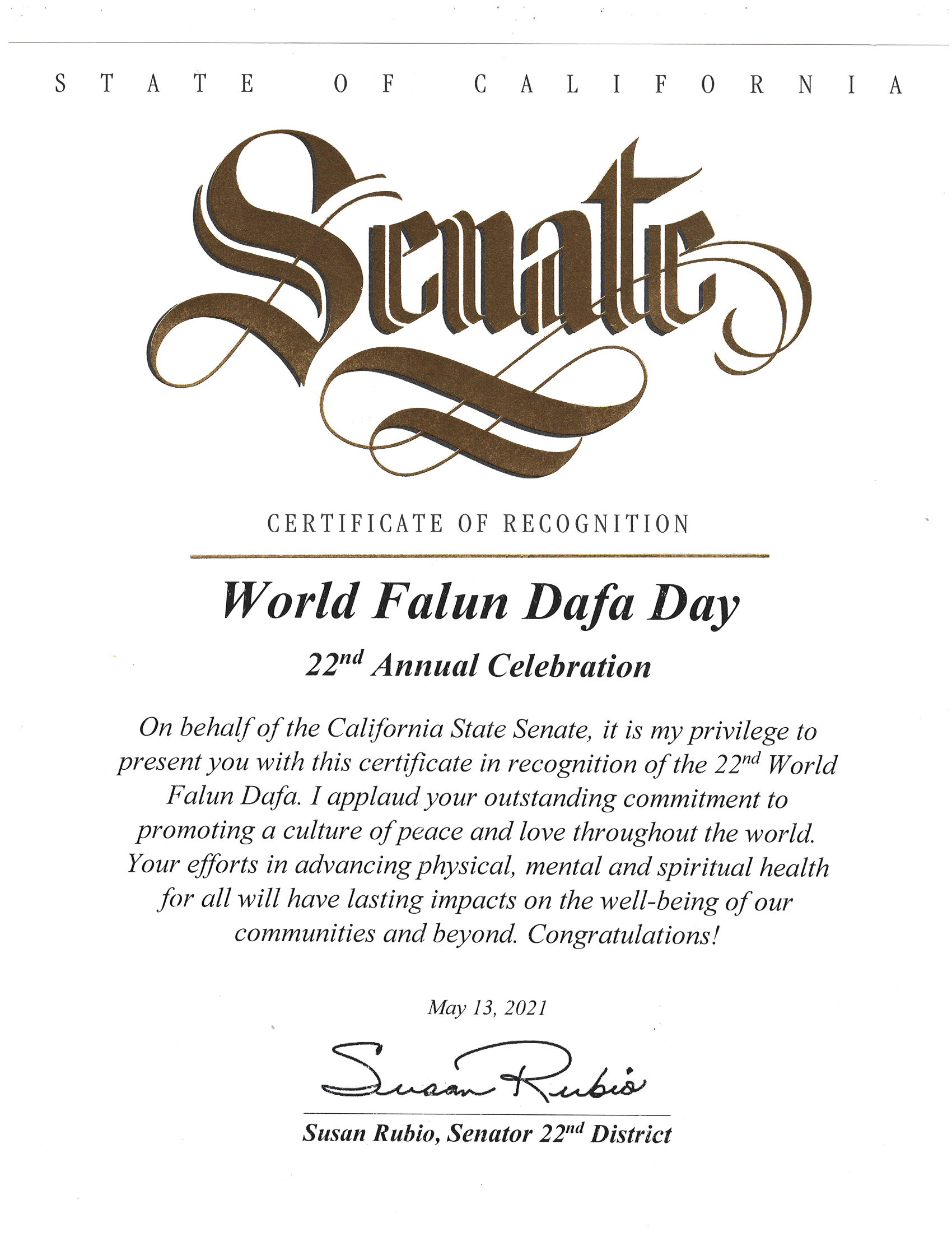 加州第二十二选区州参议员苏珊·卢比奥(Susan Rubio)对法轮大法学员表示祝贺。她说:“我很荣幸地代表加州参议院向您颁发这份褒奖,以表彰第22届‘世界法轮大法日’。我赞赏你们在全世界弘扬和平与爱的文化所做出的杰出努力。你们为促进所有人的身心健康所做的努力,将对我们社区和其它地区的福祉产生持久的影响,祝贺你们!”