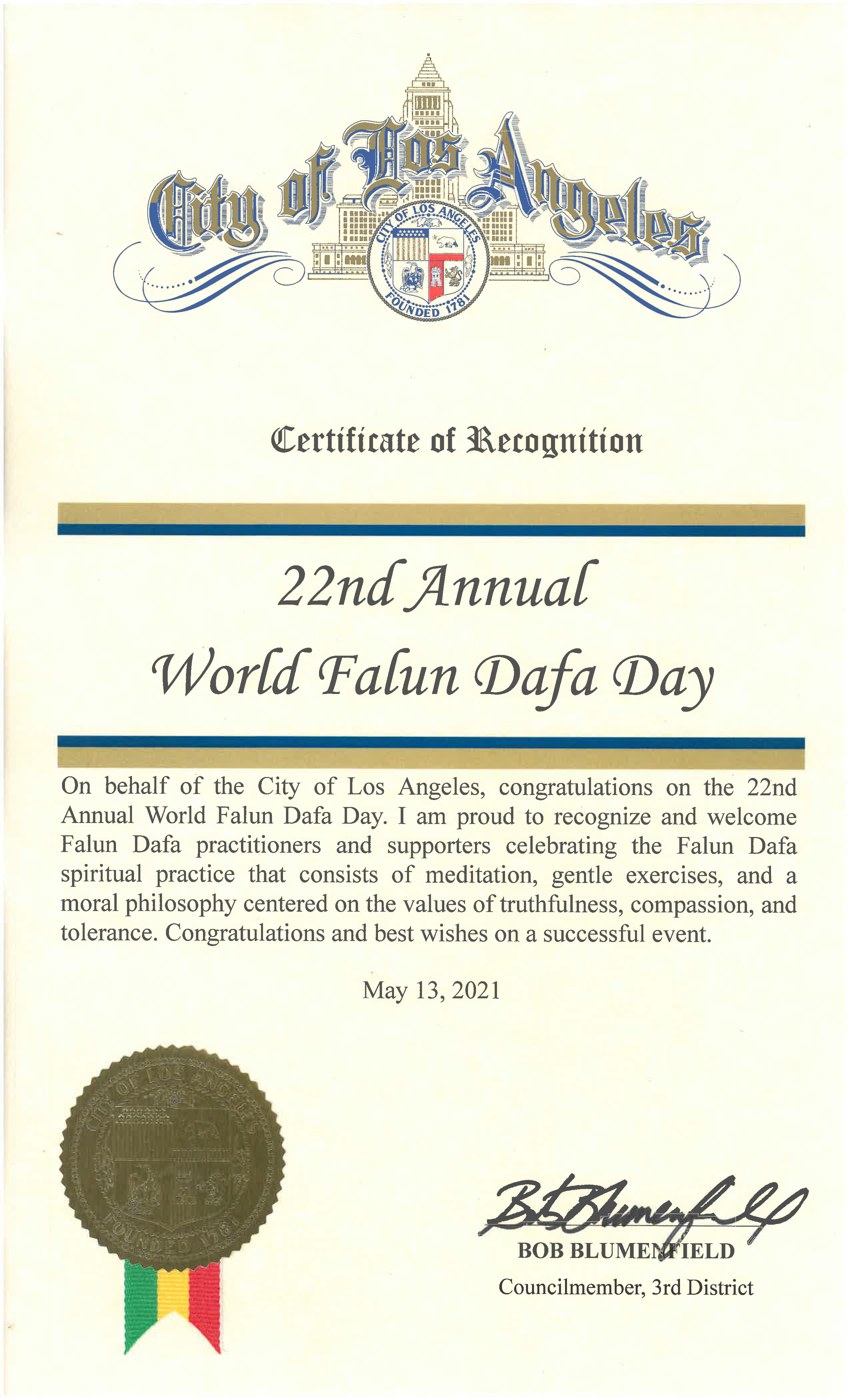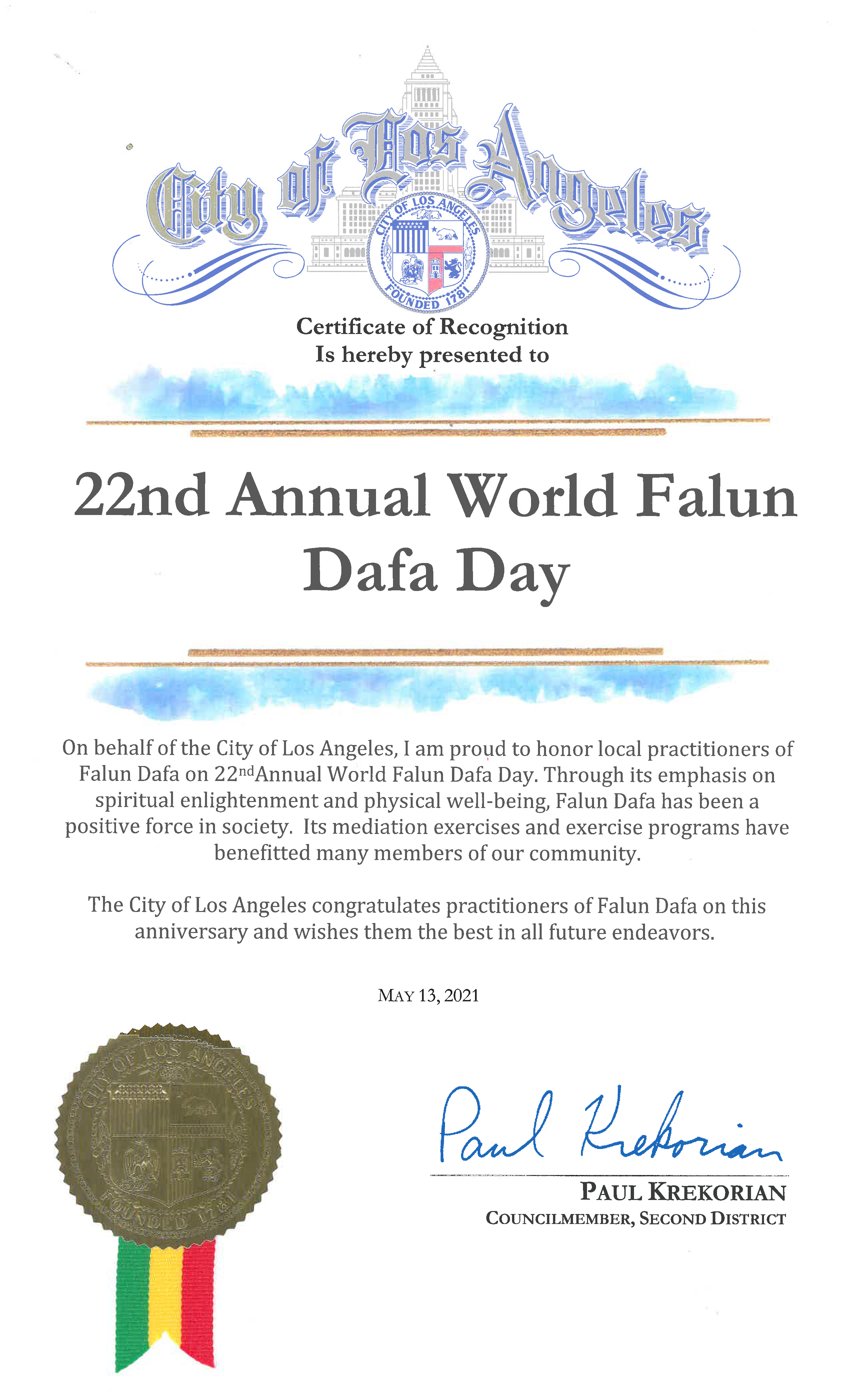 洛杉矶市第二选区市议员保罗·克雷科里安(Paul Krekorian)代表洛杉矶市府颁发褒奖祝贺第22届“法轮大法日”,并向当地的法轮大法学员致敬。他在褒奖状中表示:“通过精神启迪和强身健体,法轮大法已经成为社会正的力量,其修炼功法使我们社区众多居民从中获益。”