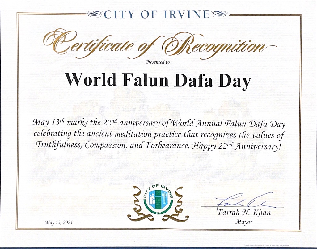 ![]() 图9:尔湾市(City of Irvine)市长拉·卡恩(Farrah Khan)褒奖“世界法轮大法日”。 |
