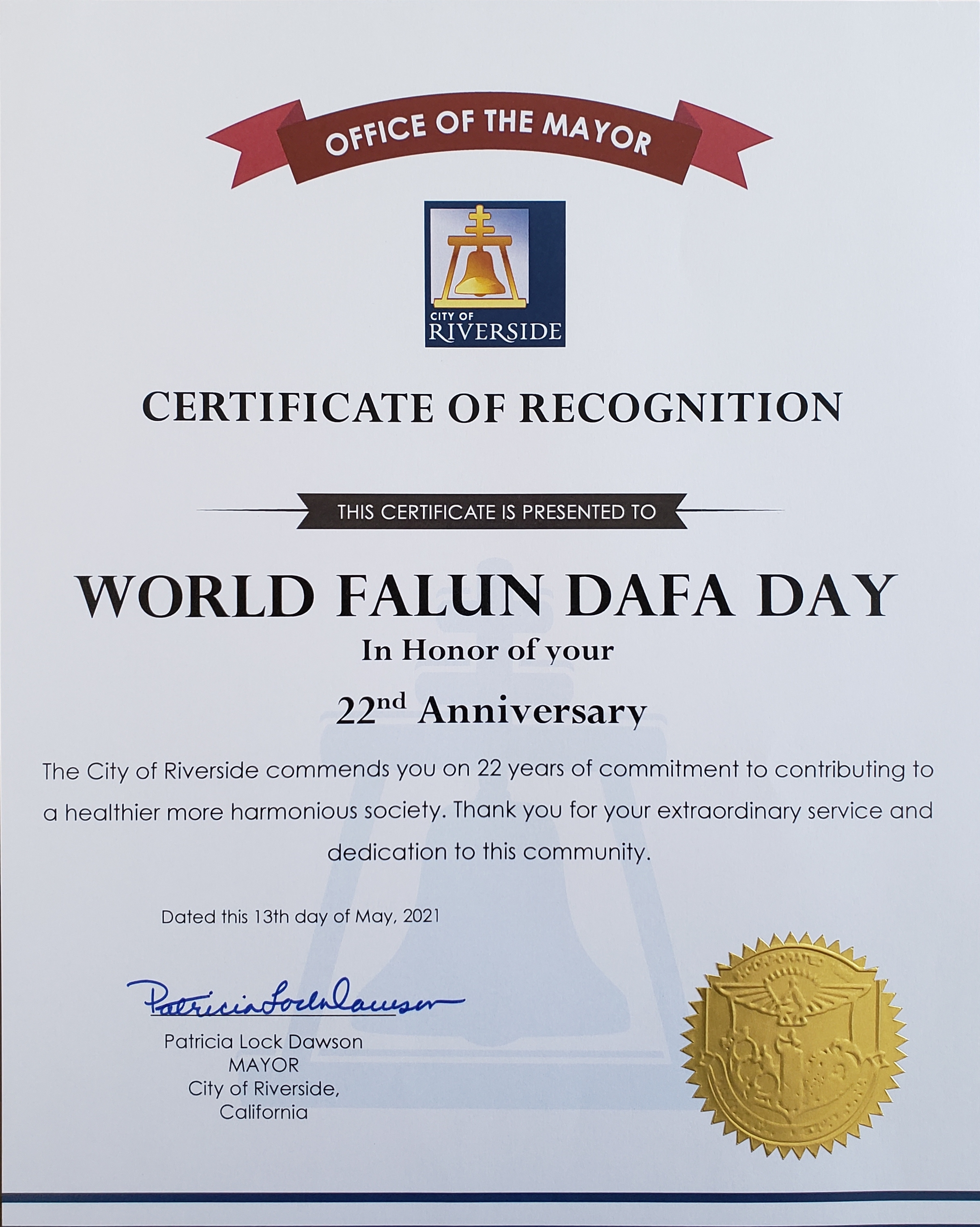 河滨县(Riverside County)全体县政委员把今年五月十三日定为“世界法轮大法日”。褒奖中说:“法轮功的核心价值是真、善、忍。法轮大法教导人们宇宙最根本的特性,并作为每天生活的指导。学员们努力达到无私、更富洞见、清醒、内静和真正的健康的状态。但很不幸,这样一种有益的功法在共产中国被残酷迫害。……此褒奖为那些目前在中国无法发声的法轮功学员发声,并表达(我们)对基本人权与自由的承诺。”