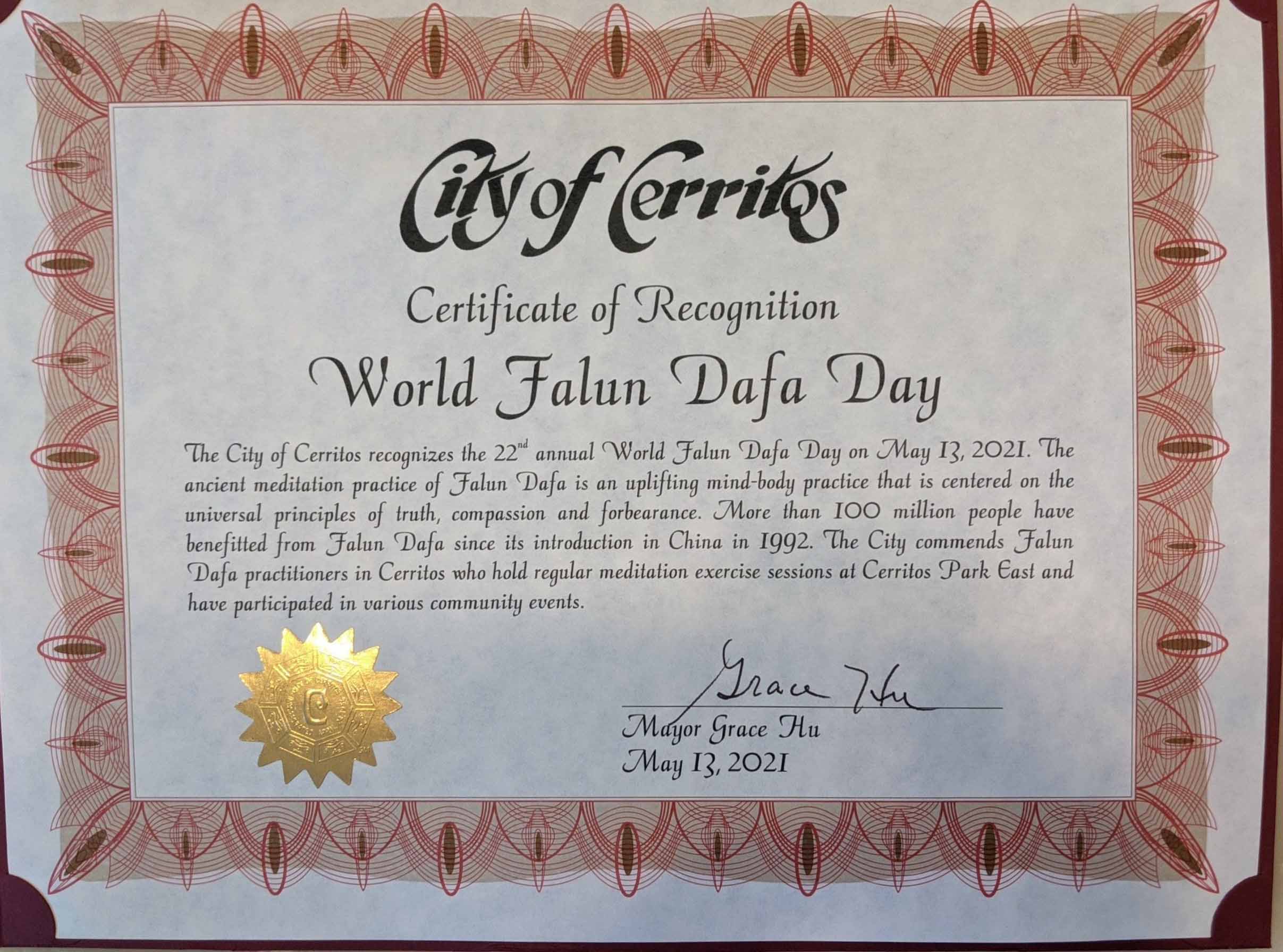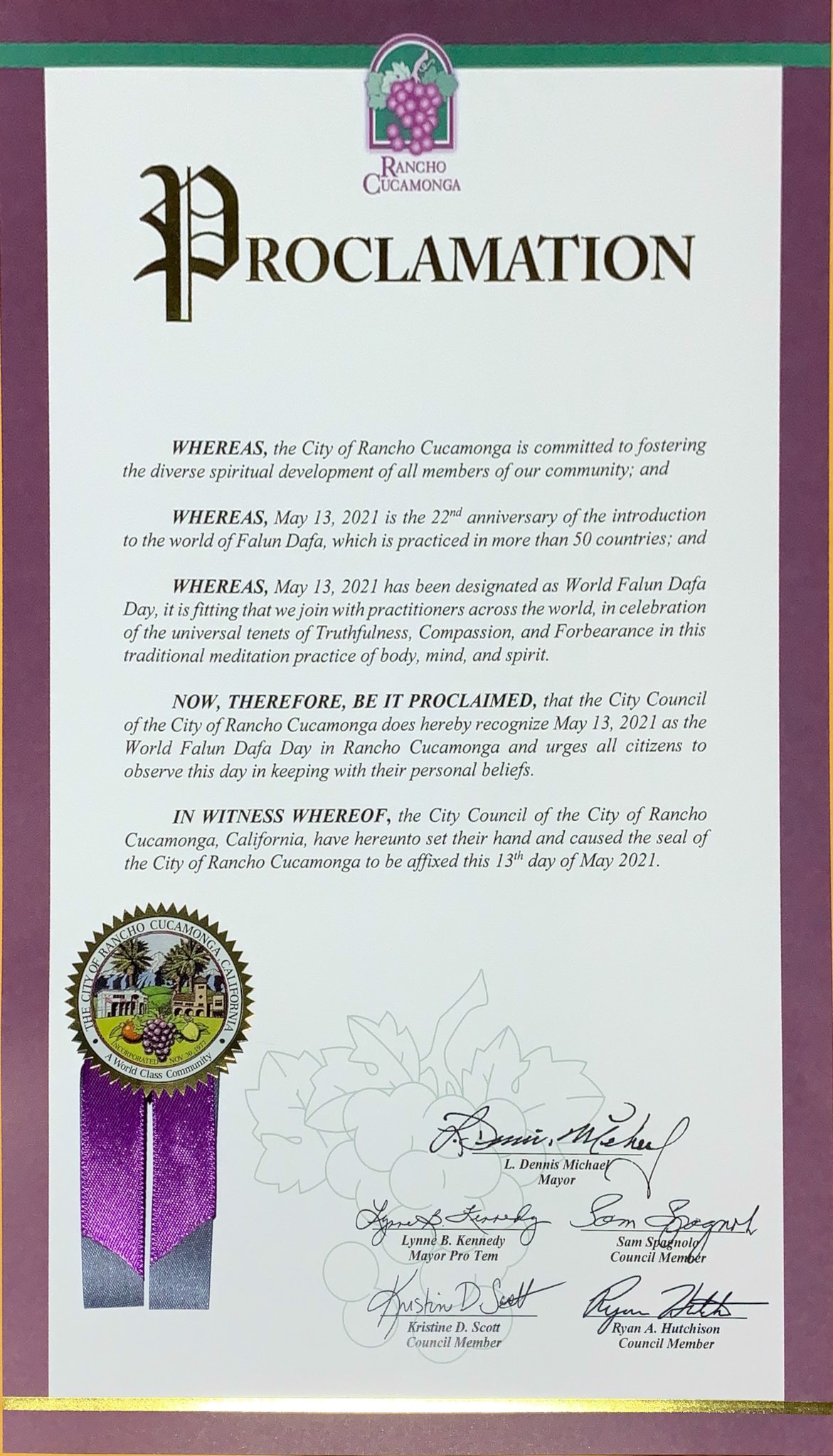 库卡蒙加牧场市(Rancho Cucamonga)加州政府重点规划的三大城市之一,该市全体市议会颁发褒奖,并将二零二一年五月十三日定为该市的“法轮大法日”。他们在褒奖状中说:“鉴于二零二一年五月十三日是法轮大法传世二十二周年。鉴于五月十三日被指定为‘世界法轮大法日’,我们应该与世界各地的修炼者一起,庆祝这个以‘真、善、忍’普世价值为宗旨的传统身心修炼大法。因此,库卡蒙加牧场市议会特此确认二零二一年五月十三日为库卡蒙加牧场市‘世界法轮大法日’,并敦促所有不同信仰的公民以自己的方式来纪念这个日子。”