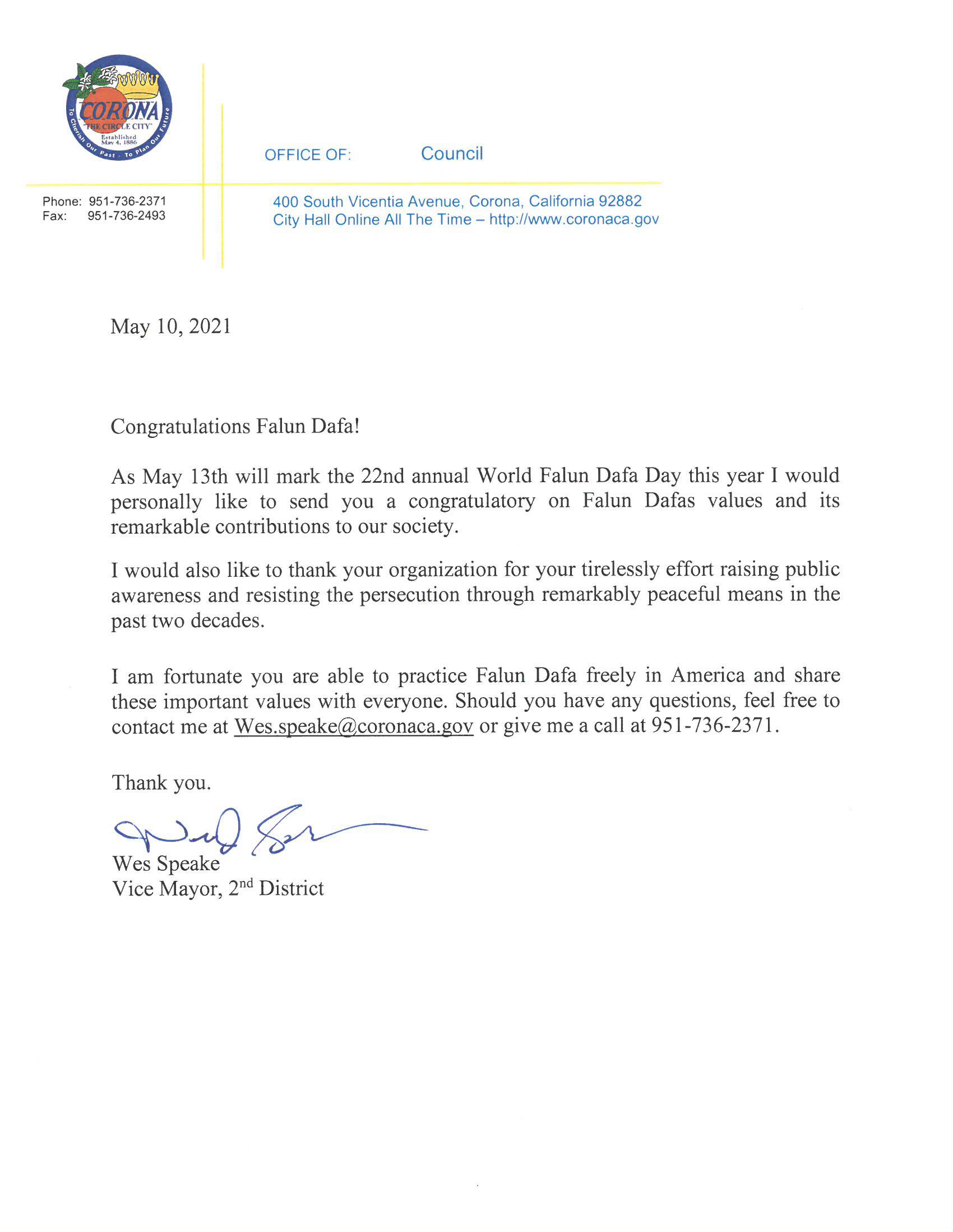 被称为南加州“内陆帝国”(Inland Empire)最宜居城市之一的科罗纳市(Corona)副市长维斯·斯比克(Wes Speake)在贺信中对当地法轮大法学员说:“今年五月十三日是第二十二届‘世界法轮大法日’,我想亲自向你们祝贺法轮大法对社会的卓越贡献。我还想感谢你们团体在过去二十年中始终通过非常和平的方式让大众了解真相和抵制迫害方面所做的不懈努力。我很庆幸你们能在美国自由修炼法轮大法,并与大家分享这些重要的价值观。”