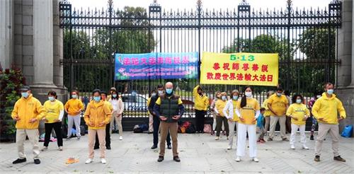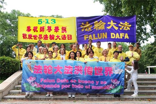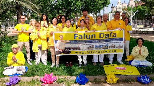 ![]() 图4~5:庆贺法轮大法日,部份西班牙学员集体炼功洪法 |