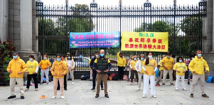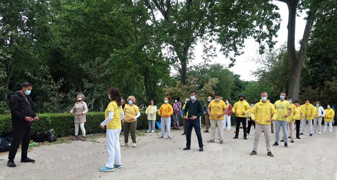 五月的马德里,春光明媚,气候宜人;虽然是疫情期间,但是公园里人们仍然是游兴不减,全家出游或者朋友结伴同游。学员们摆放好介绍法轮大法的图片展板,挂起横幅后随着法轮大法舒缓悠扬的炼功音乐,学员们开始演示五套功法,祥和平静的炼功场景吸引了不少游客驻足观看。