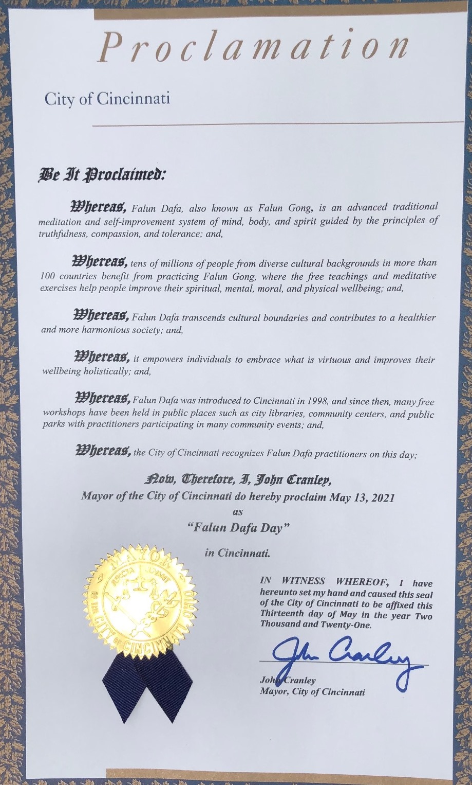 现在,鉴此,我,辛辛那提市长约翰·克远利宣布:二零二一年五月十三日这天为辛辛那提市“法轮大法日”