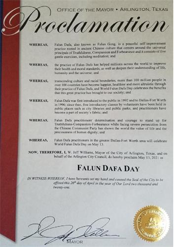 美国德州阿灵顿市(City of Arlington)宣布“法轮大法日”