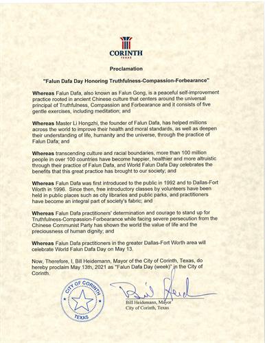 美国德州科林斯市(City of Corinth)宣布“法轮大法日”