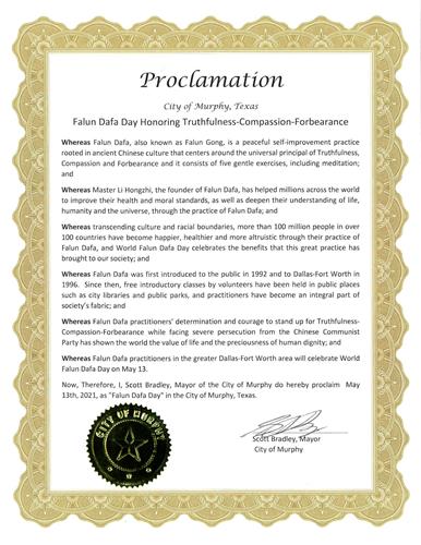 鉴此,我,斯科特·布拉德利(ScottBradley),墨菲市市长,宣布二零二一年五月十三日为德州墨菲市“法轮大法日”。
