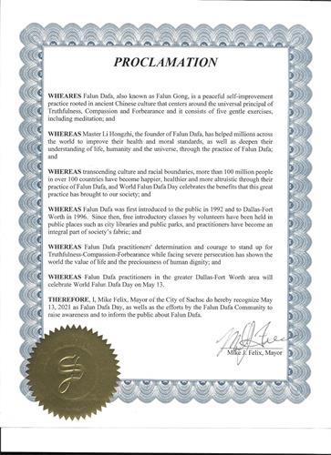 鉴此,我,迈克·费利克斯(Mike J. Felix),萨克斯市市长,宣布二零二一年五月十三日为德州萨克斯市市“法轮大法日”并赞扬法轮功学员们对提升人们对法轮大法的认知所做出的努力。
