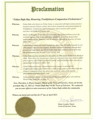 鉴此,我,亨利·莱瑟纳(Henry Lessner),费尔威市市长,宣布二零二一年五月十三日为德州费尔威市“法轮大法日”。
