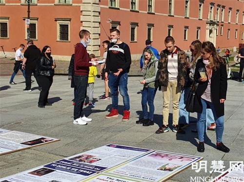法轮功学员在集体学法后,首先来到华沙中使馆前静坐,抗议中共迫害法轮功。中使馆前路过的民众一拨又一拨的驻足观看法轮功展板,接过真相传单,有人拍照展板内容,有人现场手机上网了解更多资讯,也不断有人伸出大拇指,赞颂法轮功学员不畏中共的精神和道德勇气。