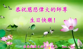 在美国的一大陆大法弟子恭祝慈悲伟大的师尊生日快乐!