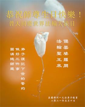 美国佛州一名大法弟子恭祝师尊华诞!恭贺世界法轮大法日!