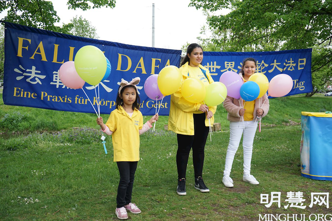 ![]() 图3:大法小弟子萨拉(Sara K.,中)和其他孩子一起参加了2021年5月13日在纽伦堡沃德湖畔的法轮大法日庆祝活动。 |