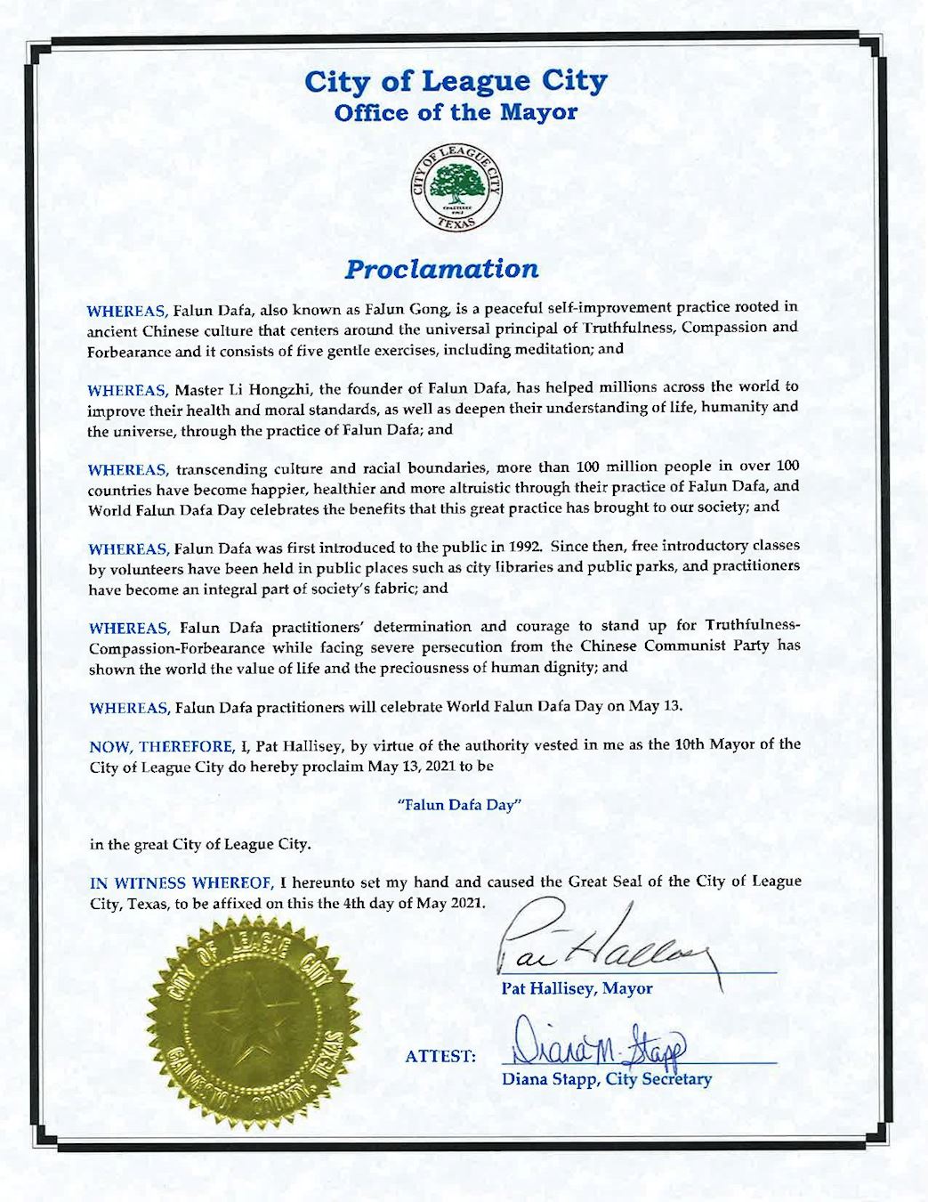 因此,我,派特·哈里斯 (Pat Hallisey),凭借我里格城第十任市长的权力,特此宣布二零二一年五月十三日,为“法轮大法日” 。