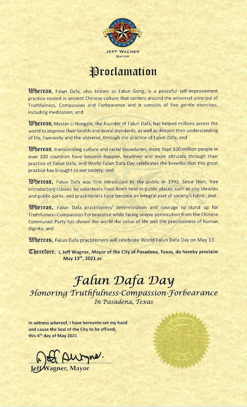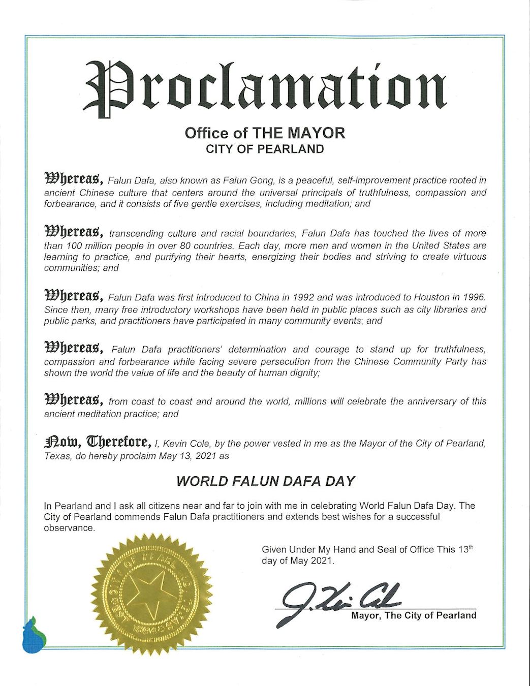 因此,我, 凯文·科尔 (Kevin Cole),作为德州梨园市长,特此宣布二零二一年五月十三日,为“世界法轮大法日” 。