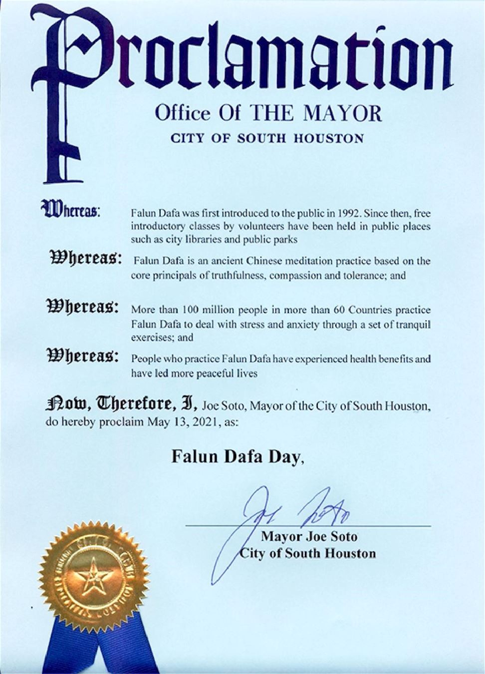 因此,我,乔·索托,作为南休士顿市长,特此宣布2021年5月13日,为“法轮大法日”。
