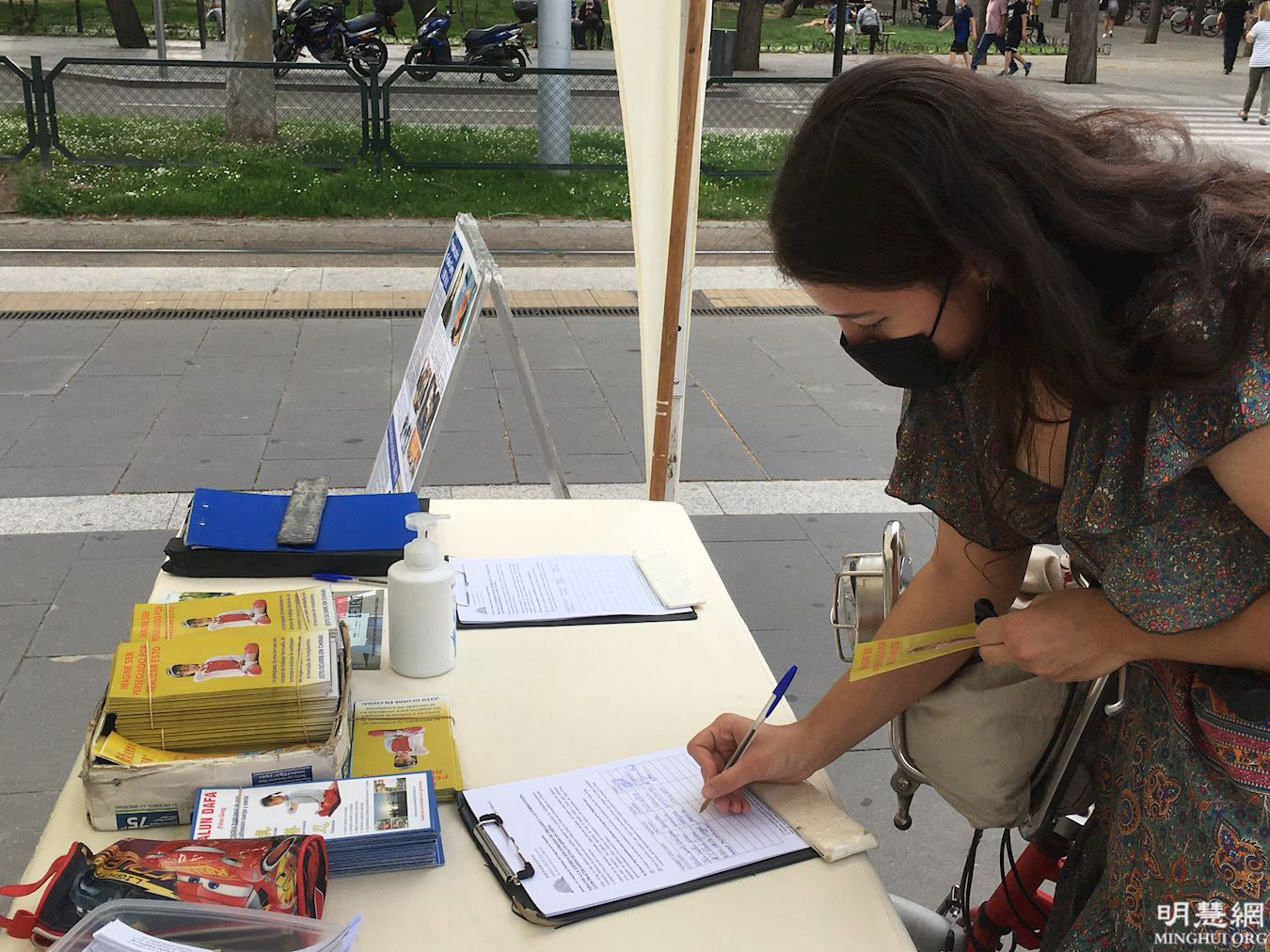 还有一对夫妇也在征签簿上签了名。妻子表示自己曾在脸书上看到西班牙文的对法轮功的迫害的真相。