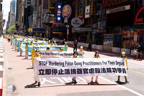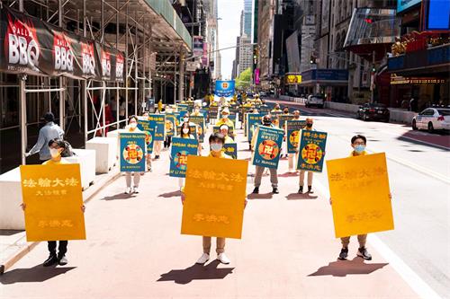 游行在世界著名的纽约曼哈顿四十二街上举行,从第二大道联合国对面的广场一直走到第十二大道的中领馆前,横穿纽约市。上午十一点,游行开始,从二大道到十大道都是身着黄色T恤精神抖擞的法轮功学员。四十二街上犹如展开了一道五彩缤纷的流动画卷,各式大横幅,展板,旗帜,讲述着大法弘传的辉煌和法轮功学员的和平理性反迫害以及近四亿勇士退出中共党团队的壮举。
