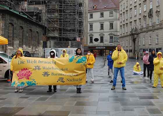 五月十三日,奥地利部份法轮功学员在维也纳著名的史蒂芬大教堂广场前举行活动,庆祝世界法轮大法日,恭祝师父七十岁华诞。