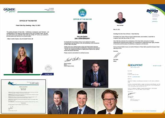 加拿大亚省各市镇市长和议员向法轮大法学会发来贺信和褒奖,恭祝法轮大法日,冷湖市并宣布5月13日为法轮大法日。