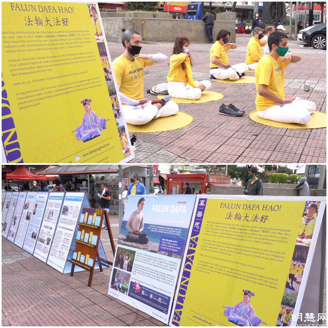 图1:二零二一年五月十三日,巴西法轮功学员在旅游景点——东方街自由区(liberdade)广场,演示功法和摆放真相图片展庆祝世界法轮大法日,同时传播真相。