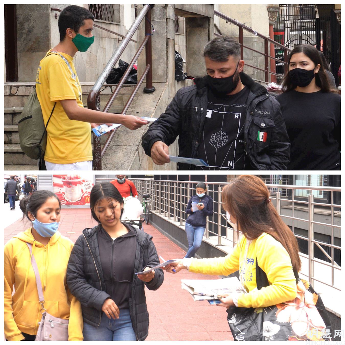 图3:在真相花车经过的沿途,法轮功学员向市民派发法轮功的真相资料。