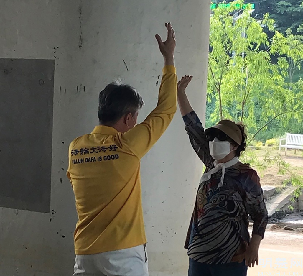 ![]() 图6:朴贞淑(音)女士看到法轮功学员炼功,觉得很神奇。 |