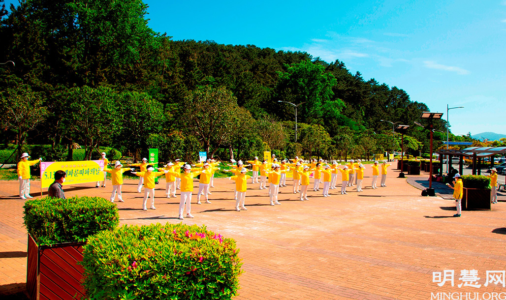![]() 图10:釜山学员集体炼功庆祝世界法轮大法日 |