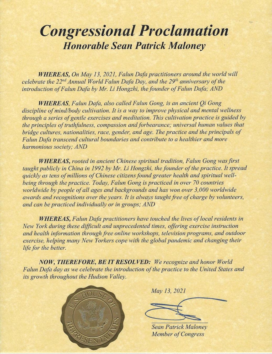 联邦第十八选区国会议员肖恩·马洛尼(Sean P. Maloney)发来褒奖,赞扬法轮大法为建立一个更健康、更祥和的社会做出了贡献,赞扬法轮大法学员帮助许多纽约人应对全球瘟疫大流行并改善他们的生活,祝贺世界法轮大法日。
