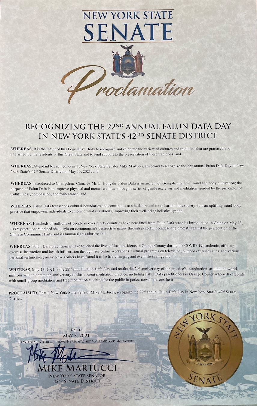 鉴于,对此关注的我,纽约州参议员迈克·马图奇(Mike Martucci),自豪地赞赏 2021年5月13日在纽约州第42参议院区举行的第22届法轮大法日;并且