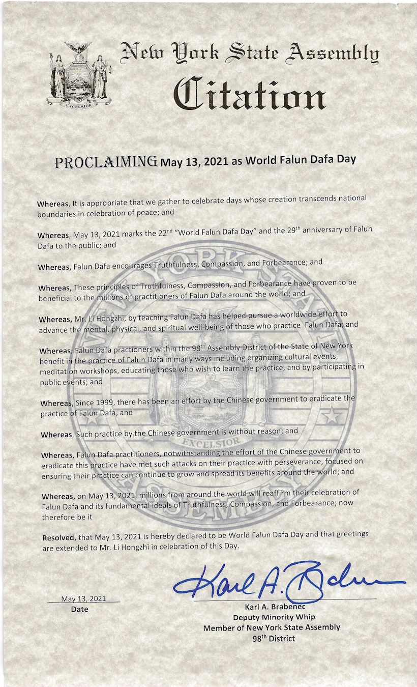 纽约州众议院第九十八选区众议员卡尔·布拉本尼克(Karl Brabenec),少数族裔领袖,发来褒奖,祝贺法轮大法日,宣布二零二一年五月十三日为“世界法轮大法日”,并向李洪志先生致以节日问候。褒奖令赞扬法轮功修炼者不接受中共的这种灭绝迫害,以对信仰的坚守应对这种攻击,并使大法持续洪传以造福全世界。