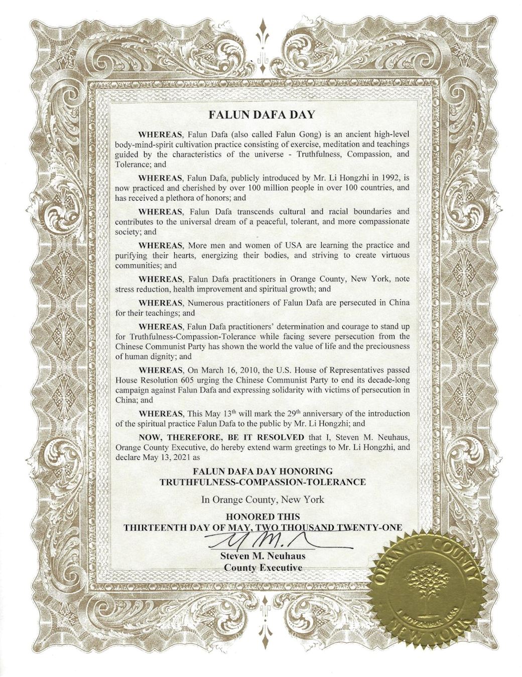 鉴此,我,纽约州橙县(Orange County)县长Steven M. Neuhaus, 特此决定,向李洪志先生致以热情的问候,并宣告二零二一年五月十三日为纽约州橙县法轮大法日,颂扬真、善、忍。