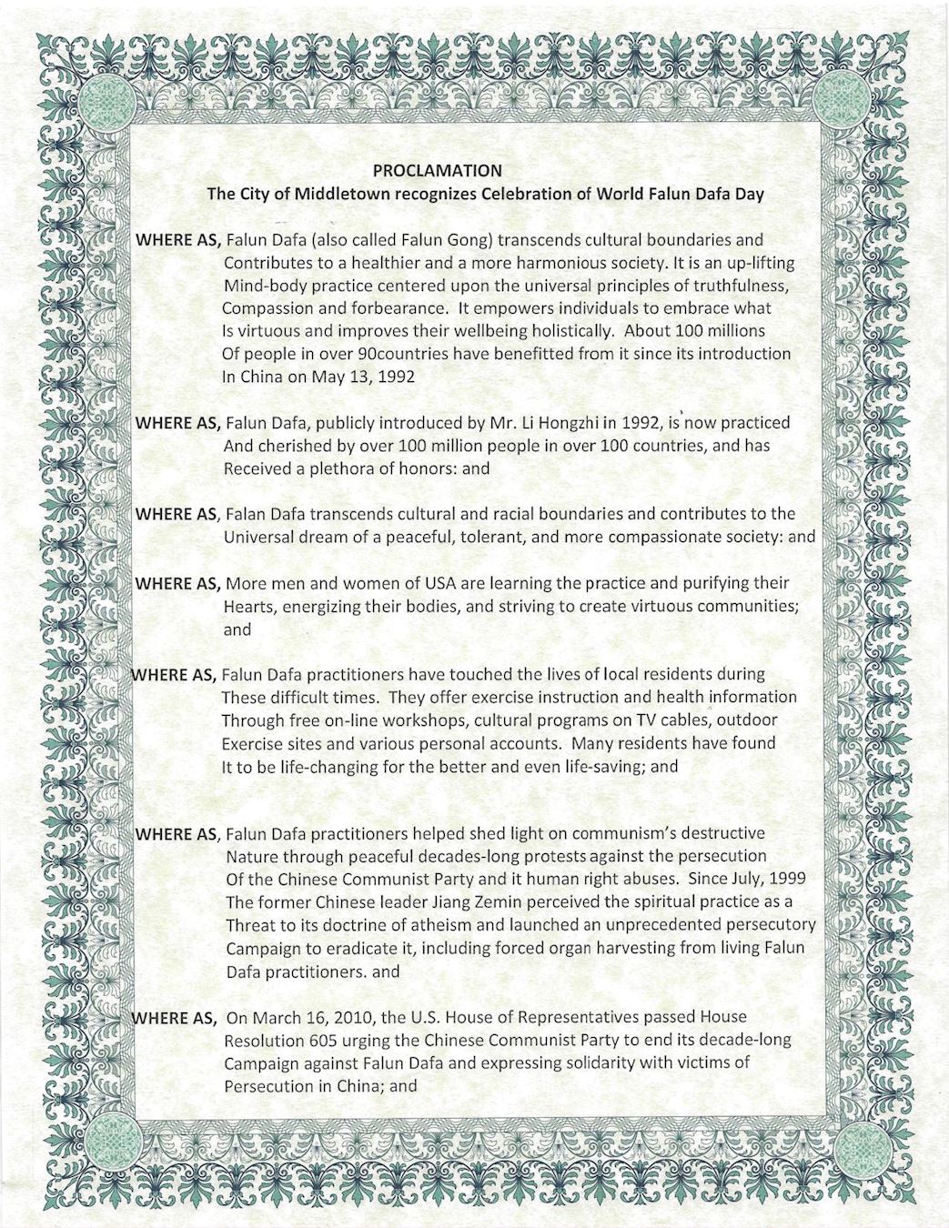 鉴于,法轮大法(又称法轮功)超越文化和种族的界限,为建立一个祥和、忍让且更加包容慈善的社会所做出的贡献;法轮大法是上乘性命双修功法,以真、善、忍宇宙特性为中心;他使修炼人能够拥抱美德,并从整体上改善他们的福祉。自1992年5月13日在中国传出以来,已有100多个国家的大约1亿人受益;并且