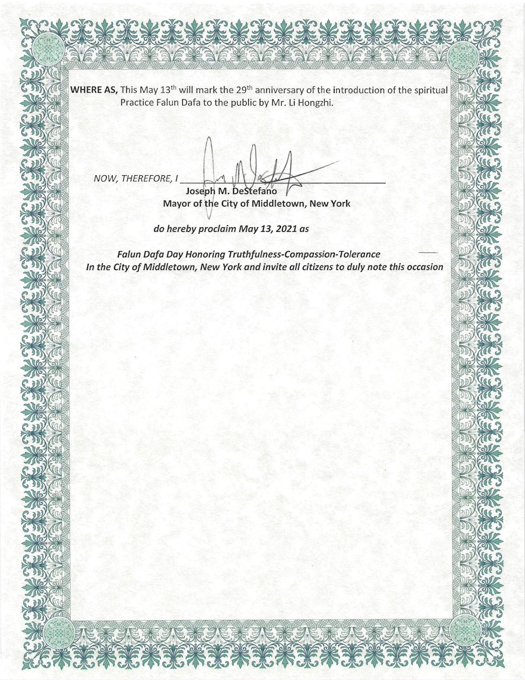 鉴此,我,纽约州米德尔敦市市长市长约瑟夫·德斯特法诺(Joseph M. DeStefano),特此宣告2021年5月13日为纽约州米德尔敦市法轮大法日,颂扬真、善、忍,并相邀所有市民关注此盛事。
