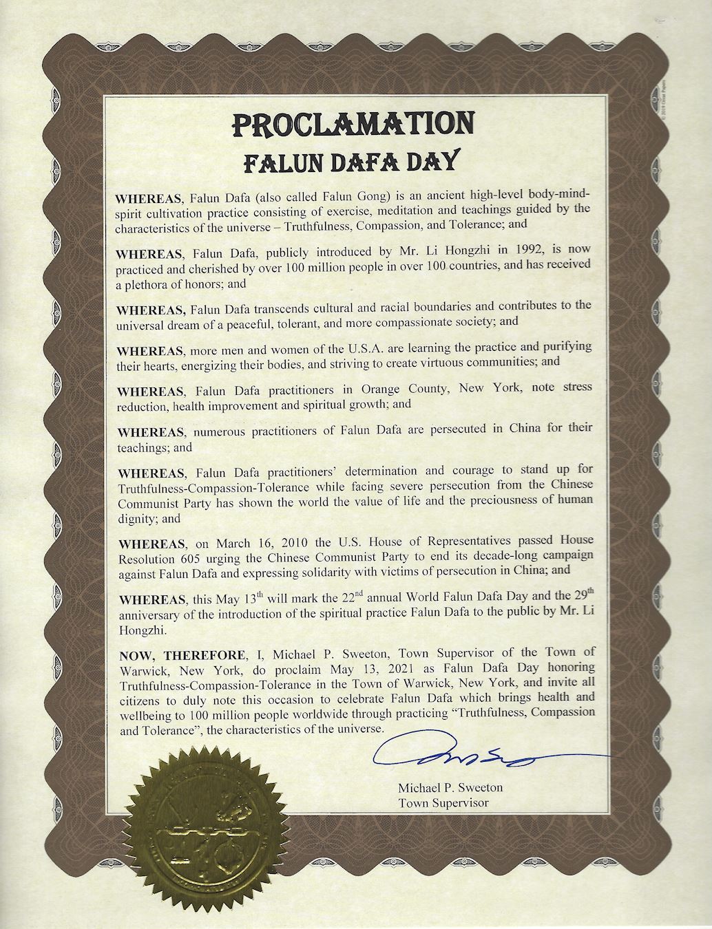 鉴此,我,纽约州Warwick镇镇长Michael P. Sweeton, 特此宣告二零二一年五月十三日为纽约州Warwick镇法轮大法日,颂扬真、善、忍,并相邀所有市民届时关注此盛事, 庆贺法轮大法给全世界上亿人民通过实践真、善、忍宇宙特性所带来的健康和福份。