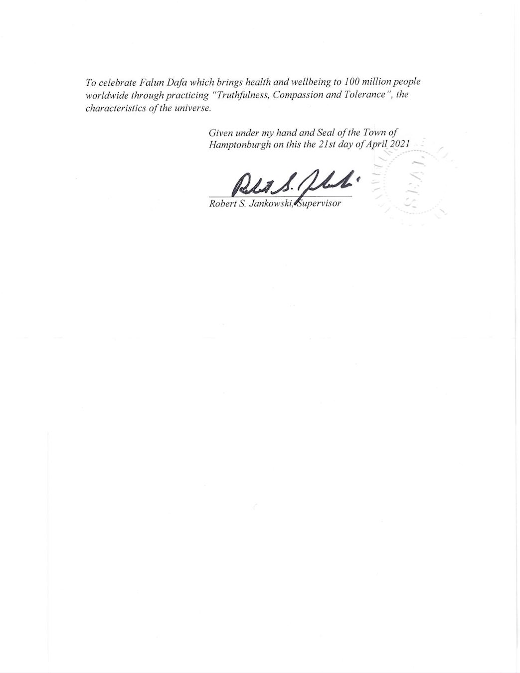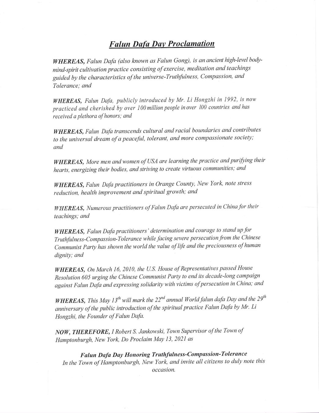 鉴此,我,纽约州Hamptonburgh镇镇长Robert S Jankowski,特此宣告二零二一年五月十三日为纽约州Hamptonburgh镇法轮大法日,颂扬真、善、忍,并相邀所有市民届时关注此盛事, 庆贺法轮大法给全世界上亿人民通过实践真、善、忍宇宙特性所带来的健康和福份。