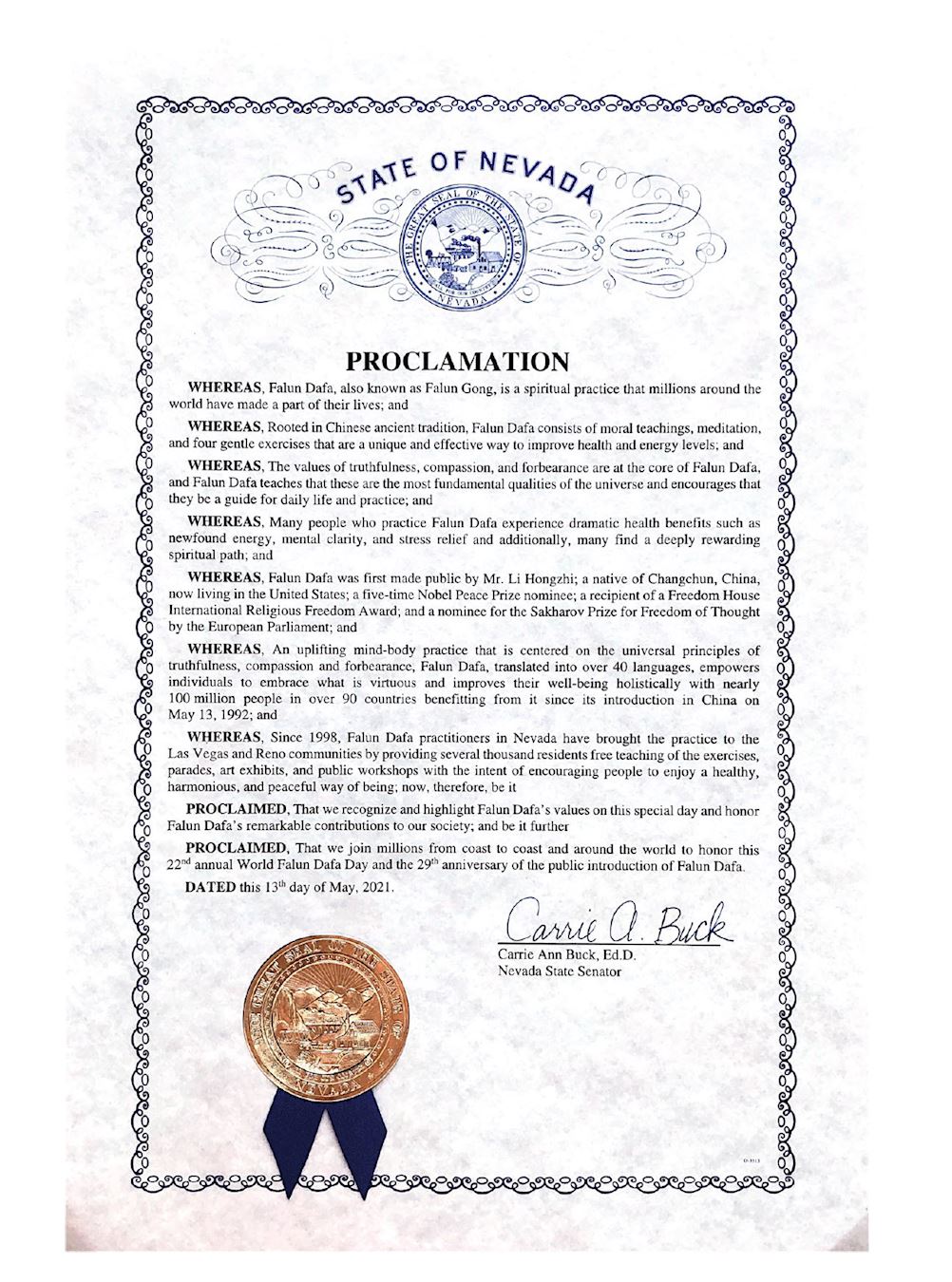 鉴于,内华达州的法轮大法学员于一九九八年通过免费教功、游行、艺术展和教功班将法轮大法带给拉斯维加斯和雷诺市的数万居民。法轮大法学员希望人们能享有健康、和睦的生活。