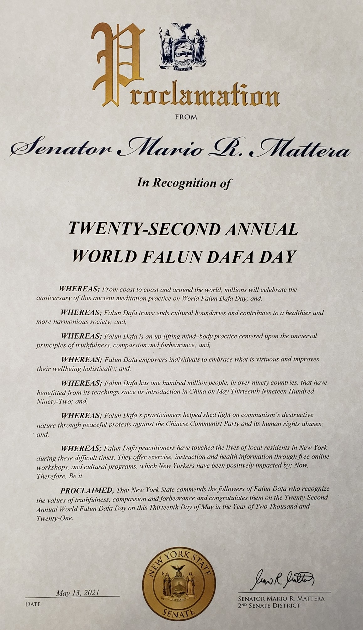 我,纽约州参议员迈克·马图奇(Mike Martucci),嘉奖在纽约州第四十二参议院选区第二十二届法轮大法日。