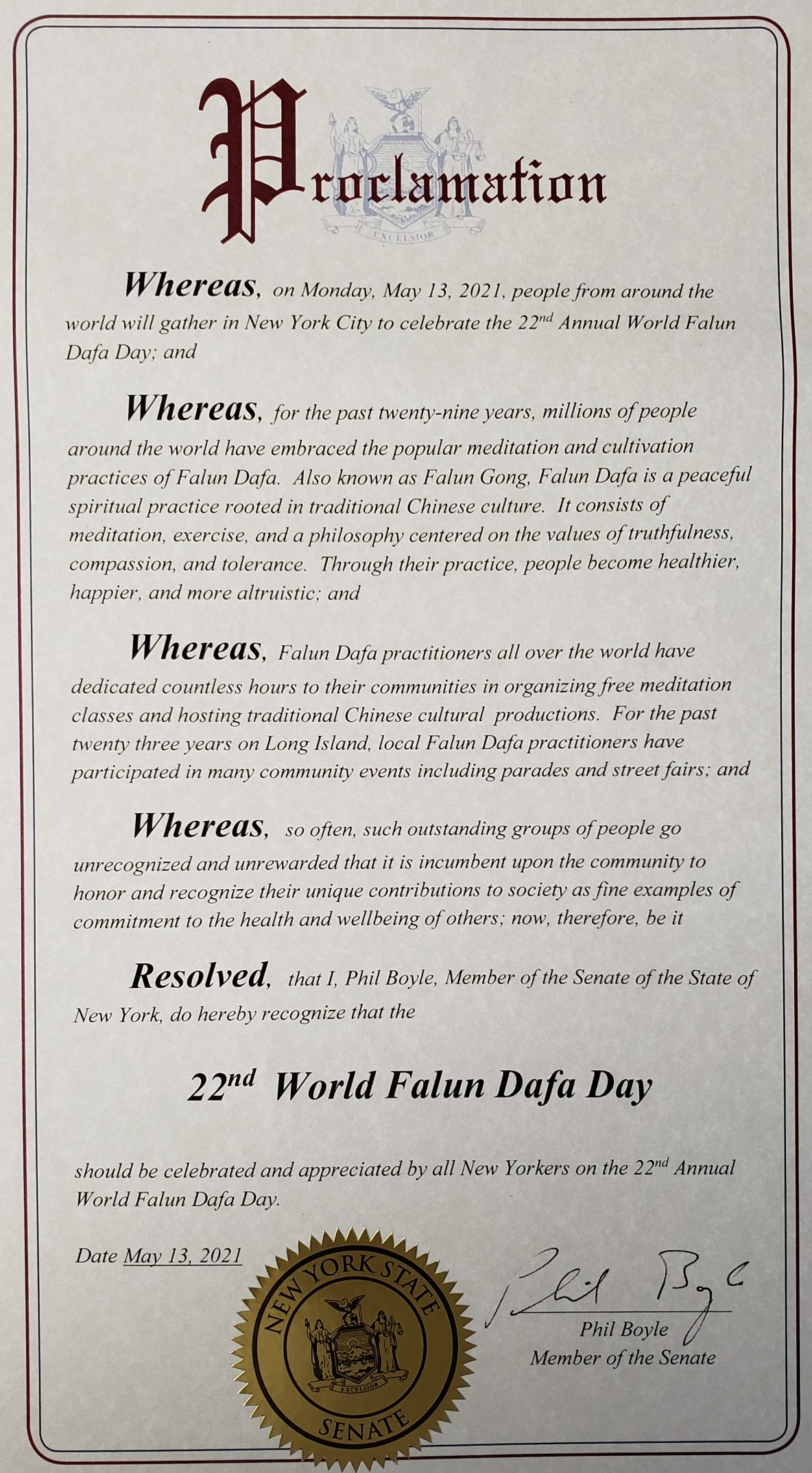 决议:我,菲尔·博伊尔(Phil M. Boyle),纽约州参议员,在此嘉奖“第二十二届世界法轮大法日”,应当在此日被全纽约人所庆祝。