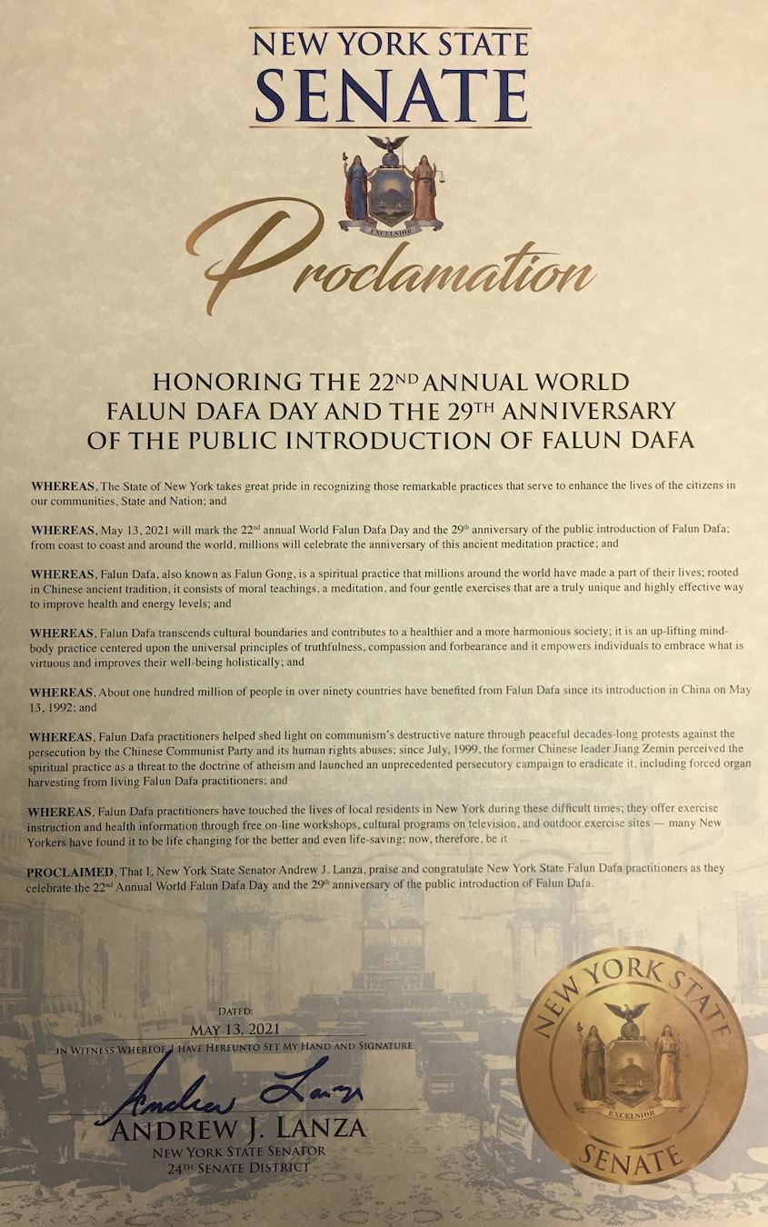 宣告,我,纽约州参议员安德鲁·兰札,在纽约州法轮大法学员庆祝第22届世界法轮大法日暨法轮大法公开传出二十九周年之际,向他们表示赞扬和祝贺。