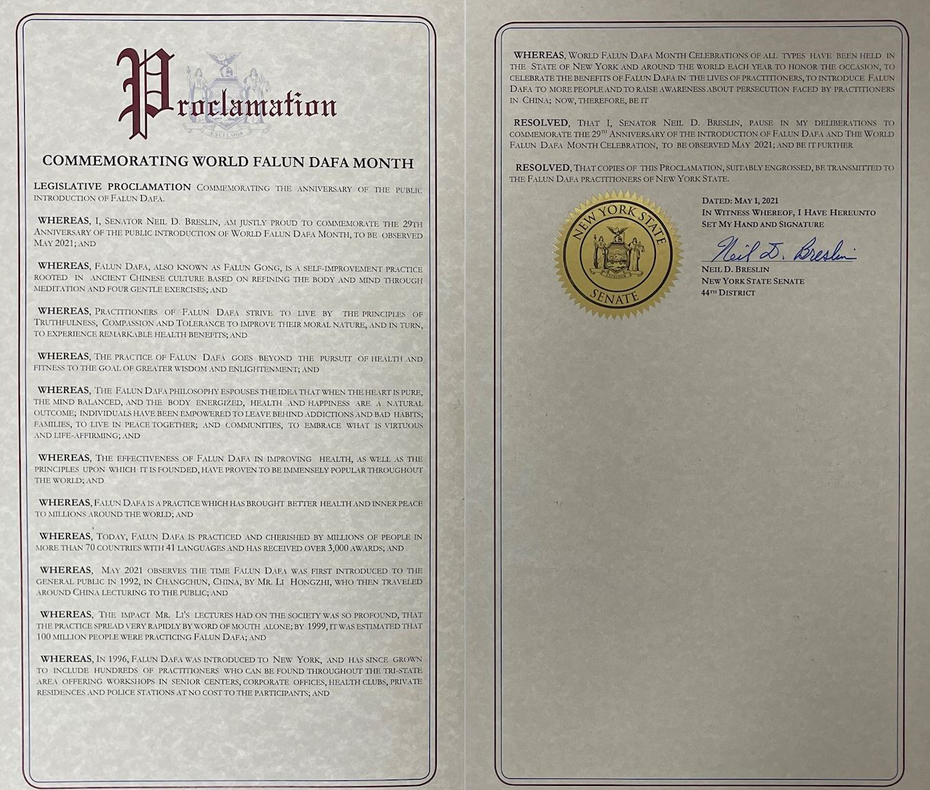 参议员们向法轮功学员表示赞扬和祝贺“鉴于,法轮大法修炼者通过二十多年的和平抗议,反对中共的迫害和侵犯人权的行为,帮助揭示了共产主义的破坏性;自一九九九年七月以来,中国前最高领导人江泽民认为精神修炼是对无神论的威胁,发起了一场前所未有的迫害运动,以消除法轮大法,包括强行摘取法轮大法修炼者的器官;因此决定,在纽约州法轮大法学员庆祝第二十二届世界法轮大法日暨法轮大法公开传出二十九周年。