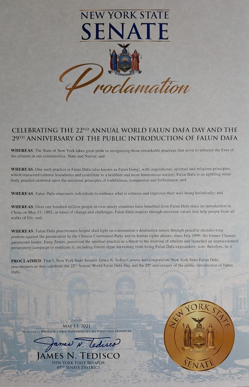 决定,我,纽约州参议员詹姆斯·特迪斯科,在纽约州法轮大法学员庆祝第二十二届世界法轮大法日暨法轮大法公开传出二十九周年之际,向他们表示赞扬和祝贺。