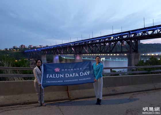 五月二十日晚,加拿大亚省首府埃德蒙顿以彩灯点亮地标建筑高架桥,以示庆祝世界法轮大法日。