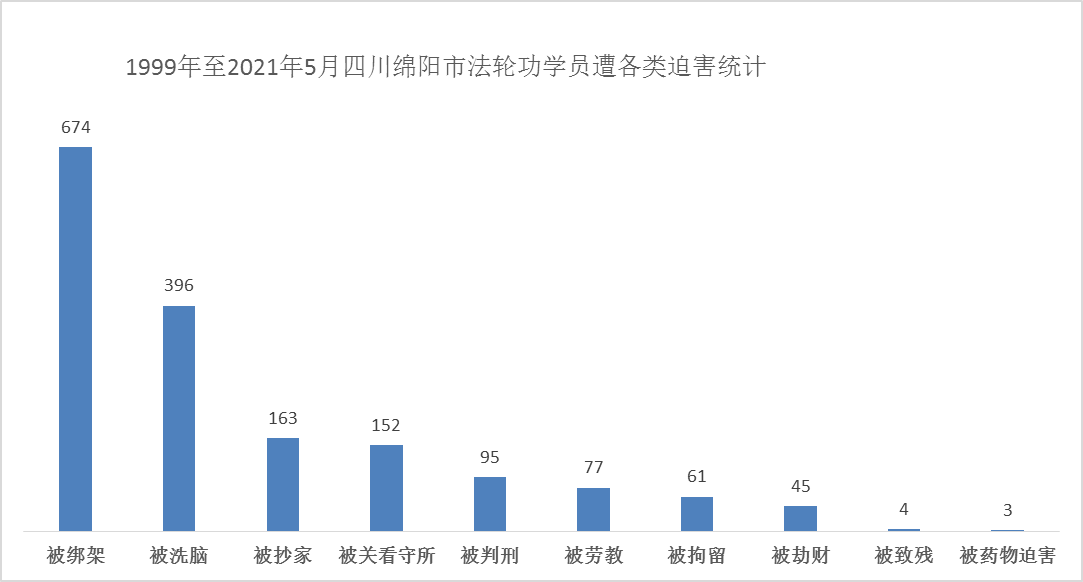 图2:1999年~2021年5月绵阳市法轮功学员遭各类迫害统计