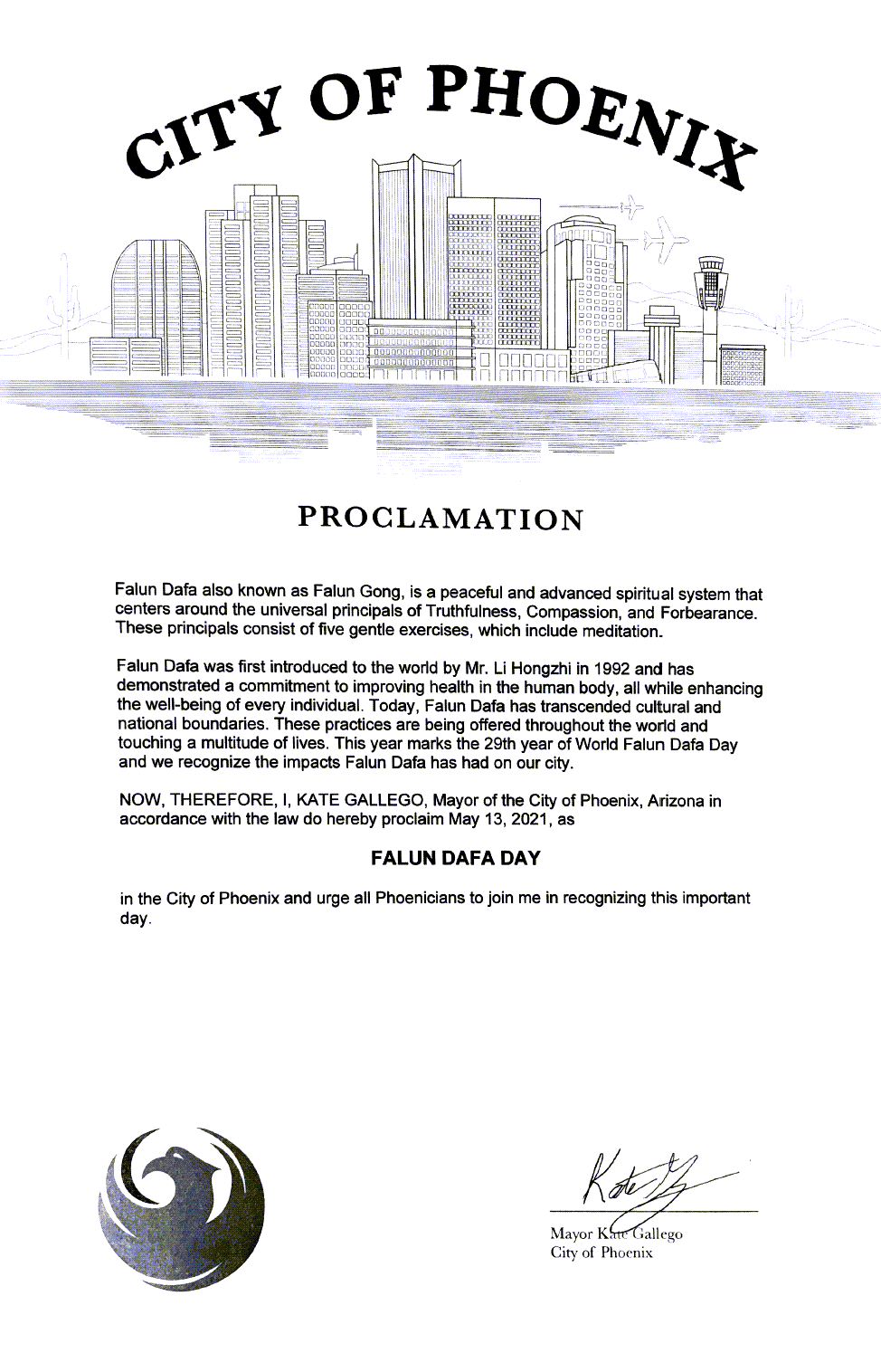 因此,我,凯特·加列戈(Kate Gallego),作为亚利桑那州凤凰城市长,在此宣布二零二一年五月十三日为法轮大法日。