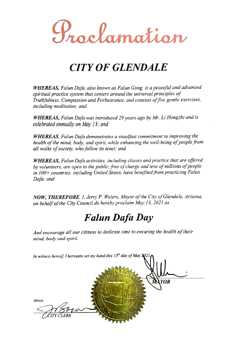 现在,因此,我,杰瑞·威尔士(Jerry Weiers),作为亚利桑那州格兰岱尔市市长,代表市议会,在此宣布二零二一年五月十三日为法轮大法日。