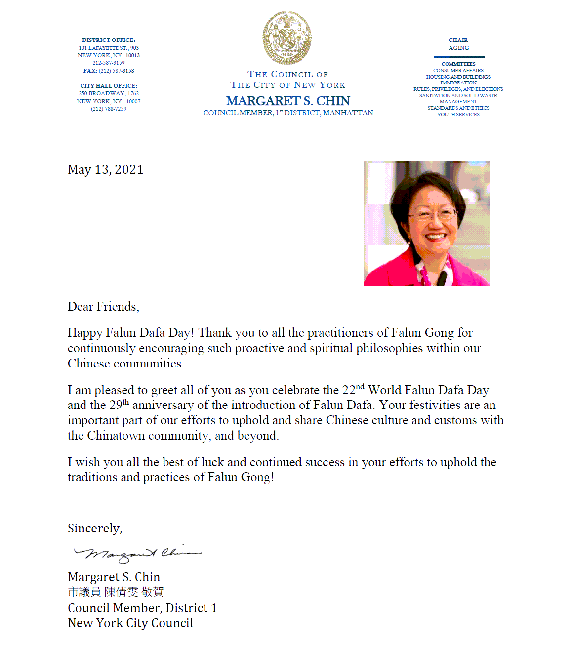 '图2:纽约市第一选区市议员陈倩文(Margaret S. Chin)发来贺信,祝贺法轮功的朋友们节日快乐。'