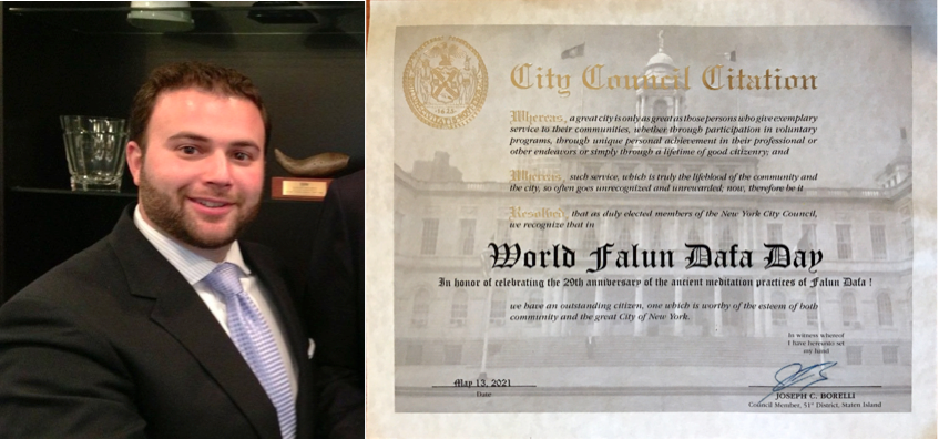 图3:纽约市第五十一选区市议员约瑟夫·博雷利(Joseph C. Borelli)祝贺世界法轮大法日。